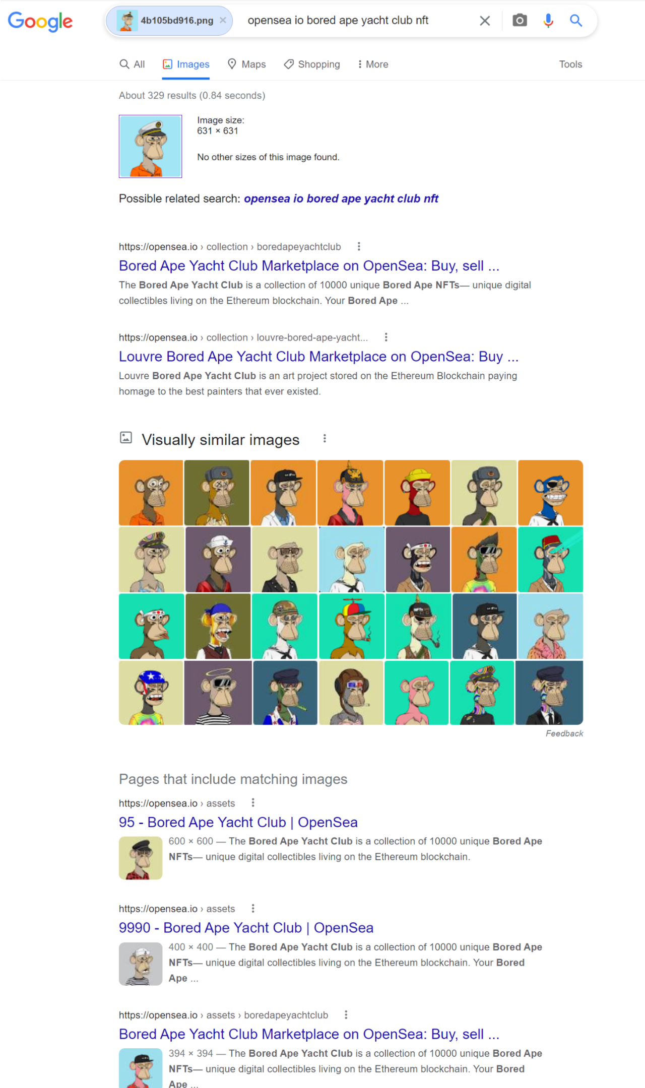 We leverage existing open-source functionality, such as Google’s Reserve Image Search, to crawl and index websites and assess rareness relative to what is known to the internet. These tools provide results which is described as “visually similar” data such as shown below: